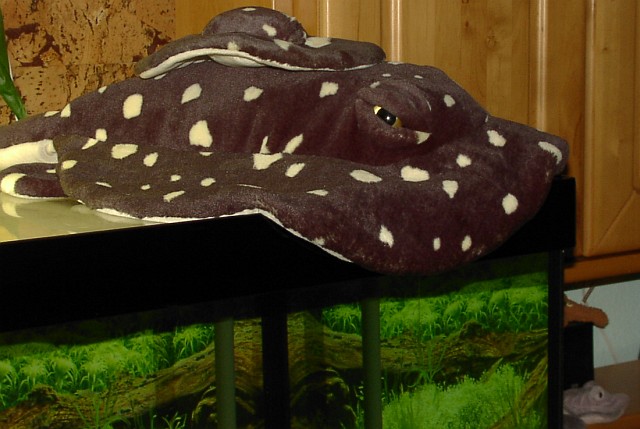 Fortpflanzung Das größte Rätsel von Plüschotrygon ist die Fortpflanzung. Balz und Paarung konnten noch nie beobachtet werden, trotzdem erscheinen ab und zu neue Exemplare. Lediglich bei einer Art wurde bislang eine Schwangerschaft und Geburt beobachtet, der Nachwuchs konnte durch einen reißverschlussartigen Mechanismus das Muttertier verlassen. In diesem Fall waren die Jungtiere dem Muttertier sehr ähnlich. Normalerweise gehören die neuen Exemplare zu unbekannten Arten. Es kann nur spekuliert werden ob diese plötzlich auftretenden neuen Arten durch Hybridisierung oder Genmanipulation entstehen. Da die Staubnahrung offensichtlich nicht genug Energie für die Fortpflanzung liefert, haben diese Rochen eine andere Fortpflanzungsstrategie entwickelt. Sie sind zur parasitären Lebensweise übergegangen und vermehren sich dadurch, dass sie ihrem Wirt (dem rochenverrückten Aquarianer sowie vielen Menschen in dessen Umfeld) Geld aus der Tasche saugen. Trotz der kostspieligen Vermehrungsweise können wir die Haltung dieser stachellosen, familienfreundlichen, friedlichen und außergewöhnlichen Rochen nur jedem empfehlen.